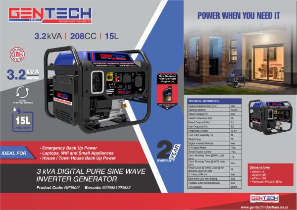 Gentech Power 3 kVA Digital Pure Sine Wave Petrol Inverter Generator I Silent – Only 68db’s I 2 Year Warranty