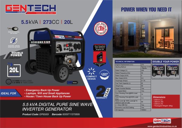 Be the first to review “Gentech Power 5.5 KVA Digital Pure Sine Wave Inverter Generator” Cancel reply